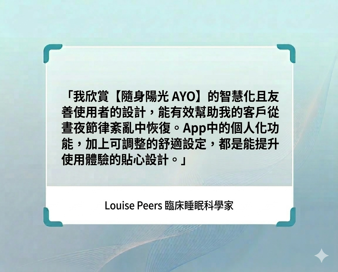 - App 智慧數據分析: 計算最精準的光照時機,讓生理時鐘調整更具科學依據。